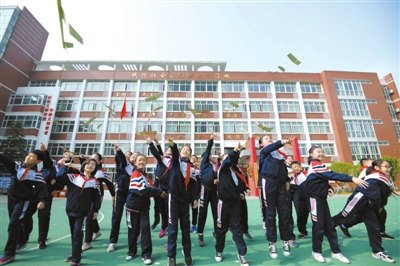 4月24日,河北省邯郸市邯山区实验小学的同学们在放飞自制航模小飞机。