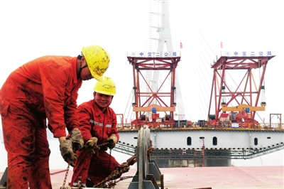 右图:中交二公局施工人员在嘉鱼长江大桥施工现场进行钢箱梁初匹配。