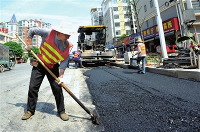 上图:在城区书台街,市安达公路养护工程有限公司员工摊铺沥青,保障道路出行通畅。