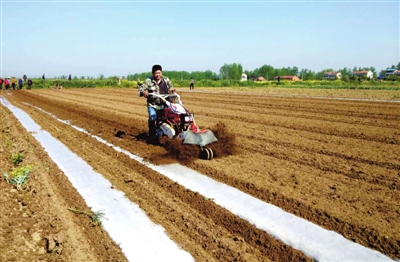 4月19日,嘉鱼县潘家湾镇肖家洲村4组,当地农户正操作覆膜机覆盖地膜。