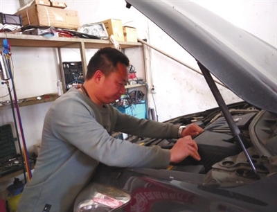 4月30日一早,汽车修理店里,举升机举起的一辆黑色轿车下,胡德辉拿着扳手,正仔细检查轿车的轮胎问题。