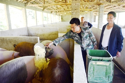 5日,赤壁市余家桥乡月星山村,村民宋伟在自家养猪基地喂养生猪。近年来,在咸宁市商务局工作队的帮扶下,他家养猪基地初具规模,年出栏100多头猪,产值超过30多万元。他致富不忘乡亲,积极为当地贫困户义务传授养猪技术,让60多人实现增收脱贫。
