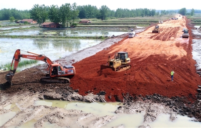 5月3日,咸安区向阳湖镇,S360大幕至向阳湖段改建工程现场,大型机械正在铺设路基。