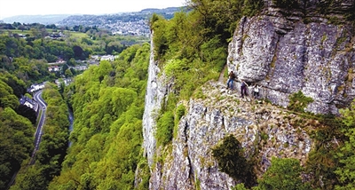 近日,一架无人机拍到一个令人瞠目结舌的时刻,一家三口人小心翼翼地走过位于英国德比郡马特洛克巴斯的悬崖上一条300英尺(约91米)高的可怕小径,途中他们只能抓着崖壁上一根钢筋来保护自己。