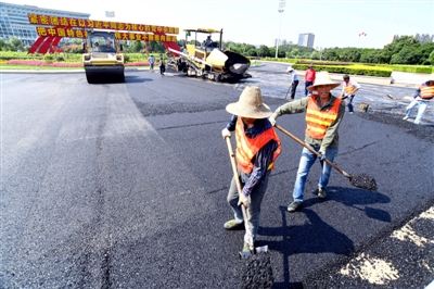 28日,天气晴好,市安达公司的施工人员在市人民广场环形道上进行路面刷黑。