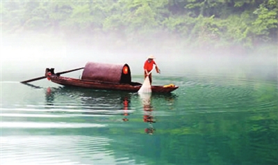 我仔细地打量着眼前的美景,狭长蜿蜒的湖面上,白雾弥漫,江水碧绿,青山倒影,渔船漂泊,犹如一幅浓墨重彩的水墨画。突然,身穿红色短袖的渔夫起身撒网。金黄色的鱼网在空中散开,再呈半球形扣入水中,静谧的湖面增添了新元素。美景让人流连忘返,自然也成就了游客相机中的大片。