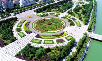 6月3日,无人机拍摄的改造升级后的市人民广场中心花坛,美丽壮观。
