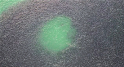 近日,一段航拍视频显示,澳大利亚悉尼海岸成千上万只鲑鱼在逃避海狮的追捕时,不断变换鱼群队形,呈现出令人着迷的巨型图案。(本报综合)