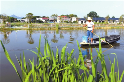 10日,在崇阳县天城镇合众富民种养专业合作社虾池基地,养殖人员正在投食。
