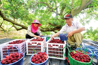 6月11日,在浙江省湖州市长兴县夹浦镇父子岭村王氏精品杨梅园内,果农将采摘的杨梅整理装篮。