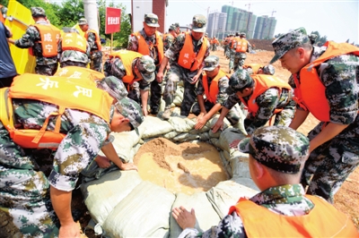 简短的动员后,由120人组成的民兵抗洪抢险应急救援营,迅即分成若干个分队进入事发现场,组织人员撤离,填装抢运沙袋……短短20分钟,便构筑了一条长30米、高1米的防洪子堤。并针对不同地段、不同险情的管涌,分别采取填筑土袋式和装配式档板围井的方法,迅速进行封堵。