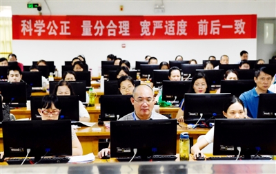 6月17日,在海南师范大学龙昆南校区高考阅卷现场,教师们在紧张阅卷。预计阅卷工作将于6月20日结束。