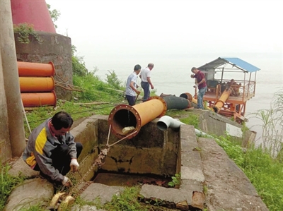 18日,在赤壁市赤壁镇,防汛抢险小分队冒雨检查检修沿堤机站闸门等设备,确保机器设备万无一失。