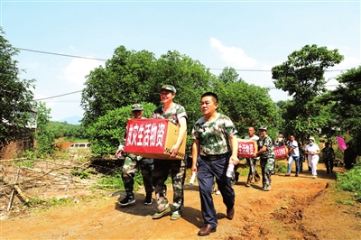 演练现场,记者看到,按照演练程序,各小组各尽其职、各负其责。首先是值班员巡查预警,发现险情后,立即向指挥部汇报,指挥部立即通过广播、敲锣、拉警报等方式通知附近村民做好转移准备。接着,现场30余名群众手拿着生活必需品,携老带幼,在应急突击队、镇、村干部组织下有序撤离。一名“受伤”的群众被紧急送到安置点,医疗救护队员迅速展开施救,清创、包扎、固定受伤肢体……随后,政府部门立即将生活物资送往安置区,慰问受灾群众,把党和政府的关怀送到群众心里。河堤因受雨水浸泡时间过长,已开始出现了小段决口,情况万分紧急,现场指挥发布抢险命令后,抢险队员迅速出击,利用机械、木桩和沙袋等快速对决口处进行封堵,将老百姓生命财产损失降低到最低。山洪退去,灾害疫情防治组立即对受灾区、转移群众安置区、群众受淹房屋前后进行防疫消毒,切实保障群众生活环境清洁。