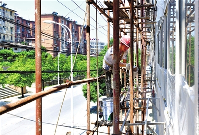 14日,赤壁市陆水湖风景区办事处泉门社区街道,工人们正在给沿街房屋立面喷真石漆。据了解,该工程于5月底开工,主要涉及镇区的蒲纺大道、随羊线沿线,改造面积2万多平方米,预计本月底完工。