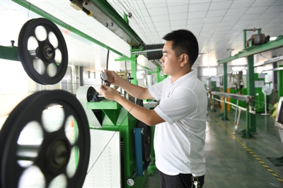 25日,通山县经济开发区永强富科技有限公司生产车间内,技术员正在测量扎带线径。