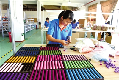 6月26日,通山县经济开发区科奥工业园,湖北紫源线业有限责任公司包装车间,员工将无梭芯底线分类打包。