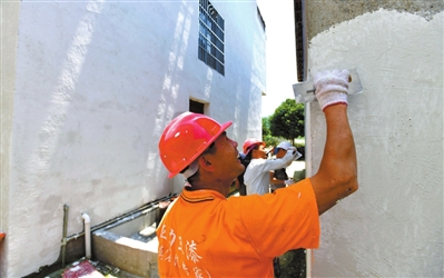 6月27日,赤壁市陆水湖风景区办事处芳世湾村,工人们正在粉刷村民房屋外墙。据了解,今年6月初,该办事处启动人居环境整治工程,对所辖的所有村湾按照统一的风格“穿衣戴帽”,改善农村人居环境,建设美丽宜居乡村。
