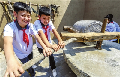 7月2日,河北省饶阳县五公镇中心学校学生在耿长锁故居体验传统石碾。