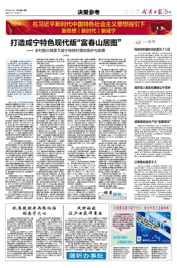 核心提要:乡村振兴是党的十九大提出的又一重大发展战略。在“两山”理念指导下,浙江广大乡村实现了从“卖石头”到“卖风景”“卖文化”的跨越。湖北省委提出,要学习借鉴浙江“千村示范、万村整治”的经验和做法,打造荆楚特色的现代版“富春山居图”。就湖北省各市州而言,咸宁最有条件,最有资格打造“富春山居图”。咸宁传统村落的保护与发展要坚持“绿”“古”“旅”融合发展的思路。具体而言,就是要做到绿色发展由深绿到中部绿心的转变,做好农村历史文化遗产的保护与开发,通过全域旅游推进乡村景区化建设,坚持绿、古、旅融合发展,做好“自然+文化”“农村+城市”的结合。