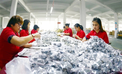 7日,湖北(通山)牛爷工贸五金有限公司员工在加班生产。