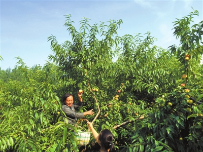 7月3日,在陆溪镇花园村桃园基地,满园的桃树枝繁叶茂、鲜果垂枝,让人垂涎欲滴。游客正在采摘桃子,不一会就摘满了整整一大筐。