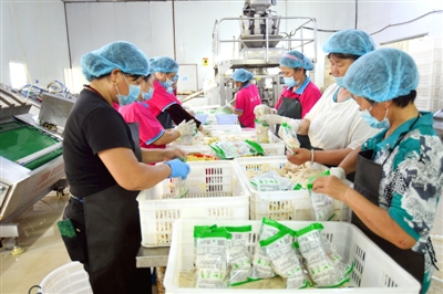 9日,位于嘉鱼县陆溪镇的湖北嘉珍生态农业发展有限公司包装区,工人正在包装藕片。