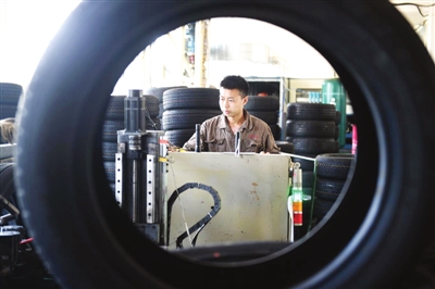 8日,湖北固特耐德轮胎科技有限公司,员工在进行轮胎防爆防扎处理。