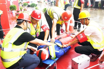 演练模拟一名施工现场作业人员不慎从3米高脚手架坠落,施工单位立即启动应急预案,通过科学有序的救援工作,及时将伤者送医救治。
