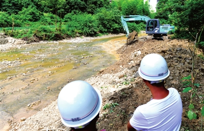 12日,崇阳县白霓镇河田港纸棚村段,大型挖掘机正在疏浚和河堤护坡。