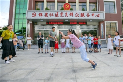 7月17日,浮山办事处银泉社区居委会,“希望家园”志愿者们正在与留守儿童一起玩趣味游戏等。