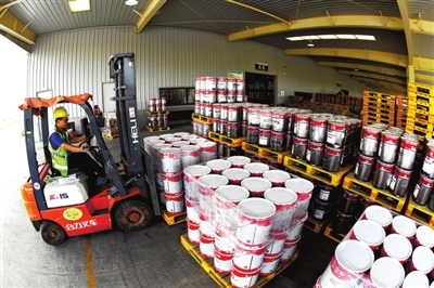 19日,立邦涂料(湖北)有限公司新型质感涂料车间,当地工人在调运产品销往外地。