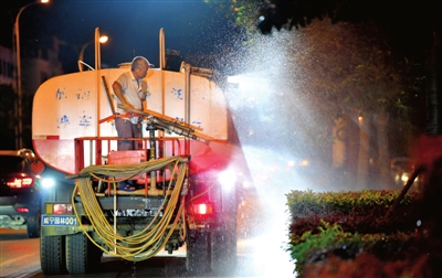 “白天地表温度太热,水浇下去会像浇开水一样,反而会伤害植物根茎。”园林部门相关负责人介绍,对此,他们制定夏季高温植物保护方案,将主次干道绿化带灌溉调整到夜间和早上进行。