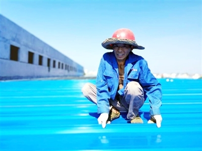 镀锌彩钢瓦、天空、易建平的工作服都是蓝色,三者融为一体。只见易建平和同伴抬着彩钢瓦走在钢架上,驾轻路熟,几分钟就铺展开了几十米远的距离。