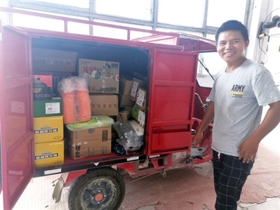 “上午趁天气凉快先送比较偏远的,下午再送就近的。平均每天5-6个小时在路上,货流量90余件。”谭义载着满满一三轮车的货物穿梭在大街小巷,每到一处用手机联系客户取件。