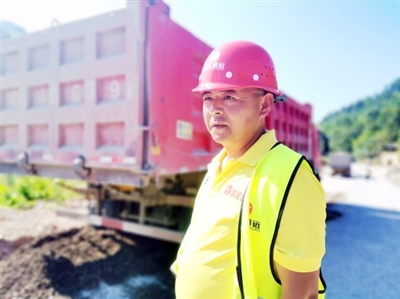 “车子再往后倒一点,挖机要上前一步。”一位头戴安全帽、皮肤黝黑的男子正忙着指挥车辆卸料。他的脸上挂满了黄豆般大小汗珠,衣服上已经结起白色的汗渍,阳光一照格外显眼。他叫段取浩,今年44岁,是该项目水稳施工负责人。