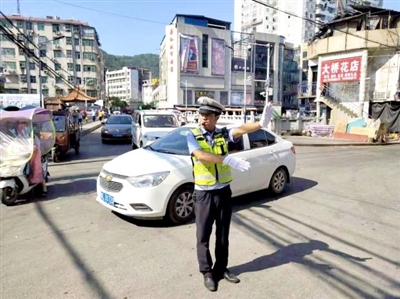 时间一分分过去,气温不断升高。疏散完路旁摊位,陈迪明的上衣早已湿透。但路上车辆排起的“长龙”让他无暇休息,他大步走到路中间,指引来往车辆前行。