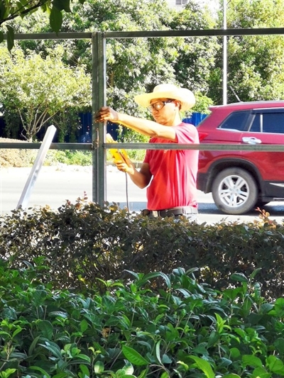 长50米、高2米的宣传护栏钢结构墙身,就是朱师傅焊接的地方。他头戴遮阳草帽,眼戴护目镜、手拿电焊点火器,背对烈日,正对着电火作业,接受着高温和电火的双重“烤”验。