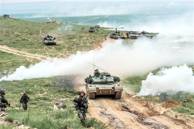 在“跨越-2016·朱日和A”演习中,红军参演部队步兵和坦克协同作战。