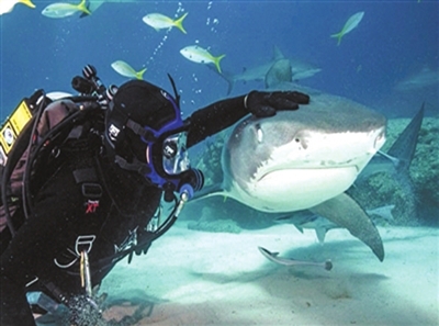 图片中和鲨鱼玩摸头杀的男子是美国一名鲨鱼专家,他从童年开始就热衷和鲨鱼一同游泳,在过去的40多年中,他利用每一次与鲨鱼同游的机会,近距离与鲨鱼接触,摸摸鲨鱼的头,观察了解鲨鱼的习性,完全把鲨鱼当成了宠物。