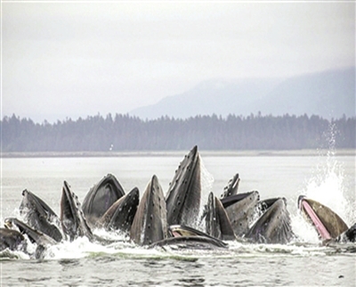 一位英国野生动物摄影师最近在阿拉斯加海域拍摄到鲸鱼自制泡泡网觅食的壮观画面。