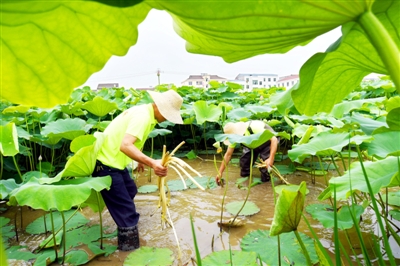 1日,嘉鱼县陆溪镇湖北嘉珍生态农业发展有限公司莲藕基地,工人娴熟地采摘鲜嫩的藕带。