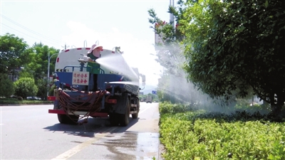 目前,每天平均出动浇水车约12车次,分两个时段对城区道路绿地进行喷淋浇水,日浇水量达138吨。