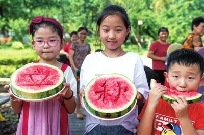 8月6日,孩子们在古银杏树下参加“啃秋”吃西瓜比赛。