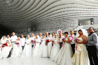 当日是我国传统节日七夕节,天津市滨海新区鹤童老年服务中心组织10对年龄在70岁以上的“金婚”夫妇,来到天津市滨海新区图书馆拍摄主题婚纱照,帮助他们弥补青春遗憾,圆老人一个婚纱梦。
