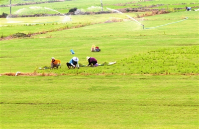 12日,赤壁市茶庵岭镇云台山村青青草坪种植基地,工人正对草坪实施除杂、喷灌。