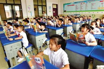 9月2日,咸宁实验外国语学校,学生在老师的带领下诵读课文《小蝌蚪找妈妈》。当天,该校5000余名学生正式开课。