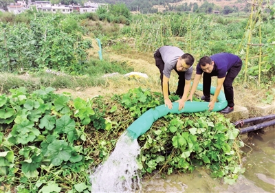 8月28日,崇阳县天城镇河田村六组,村干部在帮群众提水灌溉农田。该村持续干旱50来天,村委会除打井外,还请来挖掘机在途经该村的黄沙港河道里挖掘水坑,提水至该村沟渠,灌溉该村1200余亩水稻、鱼池、蔬菜,有效缓解旱情。