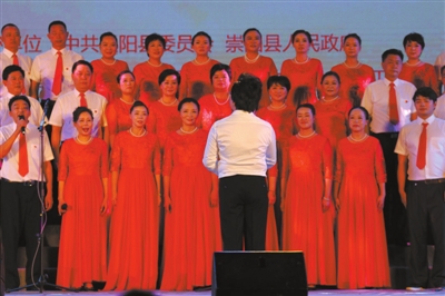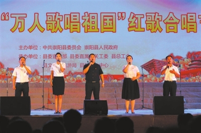 5日晚的活动现场,由县委办公室、县委政研室等单位带来的大合唱《没有共产党就没有新中国》唱出了党员干部不忘初心、牢记使命的共同心声,《共筑中国梦》讴歌了中国人民从站起来到富起来再到强起来的美丽蜕变的过程;由县人大办带来的大合唱《十送红军》深情赞美了革命根据地人民对红军的鱼水深情,《我们走在大路上》唱出了崇阳县广大党员干部牢记初心使命,砥砺奋进的豪情壮志;县政协办带来的大合唱《我的中国心》、《团结就是力量》等歌曲振奋人心,抒发了党员干部凝神聚力、团结进取,为实现中华民族的伟大复兴贡献力量的决心和勇气。《国家》、《祝福祖国》、《社会主义好》、《我的祖国》等歌曲唱出了大家对中华人民共和国70华诞的祝福,对党和人民的无限忠诚,对社会主义事业的无限热爱,充分展示了全县人民在党的领导下,加快推动崇阳高质量发展的良好精神风貌。