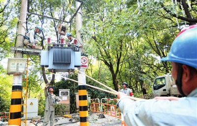 11日,温泉城区月亮湾路段,施工人员在进行专变增容改造,保障月亮湾沿河两岸景观亮化,及周边市政设施正常用电。
